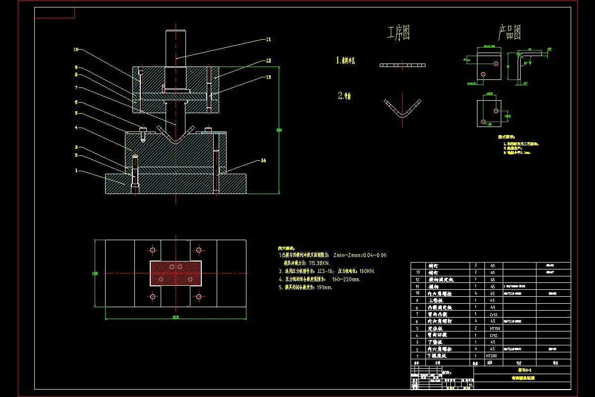 在此次设计中共设计出两副模具,一副为倒装式复合模,落料与冲孔复合,以及弹性卸料,导料钉导料的方式进行生产,且其弹性元件为橡胶。另副模具为弯曲模,采用定位板进行定位,产品向上弯曲。