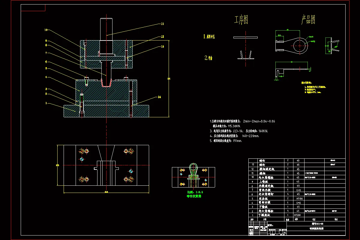 本设计对模具设计思路及结构特点进行了较全面论述。结合模具发展现状及冲压模具设计的主要技术,对拉紧片弯曲件进行了详细的工艺分析;进行了冲压力、压力中心以及模具工作部分尺寸等冲压工艺计算;并对卸料装置、定位装置及导料装置等模具结构样式进行了选择;根据计算结果以及模具结构,对模具的主要零部件进行了设计;以及对压力机进行了合理选择。