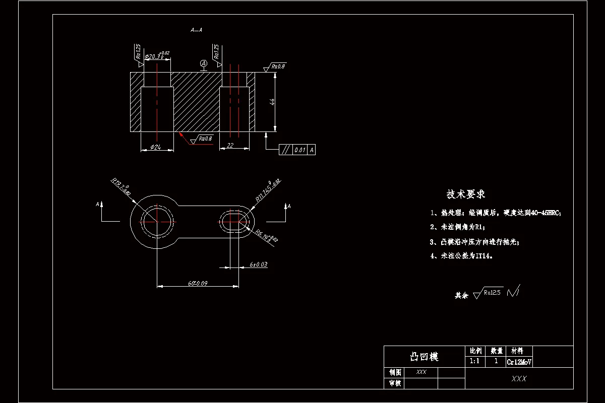 从工件的外形来分析,工件由冲裁工艺构成,工件内外轮廓均由直线圆弧相切构成,在工件上需要冲两个孔,工件具备轴对称性,属于经典的落料复合模具设计的题材。因此模具的设计和排样从冲孔、落料、等工艺分析出发,需要考虑各孔位冲裁时对外轮廓影响情况,查阅相关设计手册,工件是否符合冲裁加工。从实际生产的角度出发,为了节约模具设计、用材、制造成本,提高工件生产效率和尺寸精度,综合分析该工件的模具设计方案采用了复合模具冲裁。在模具设计前主要分析个尺寸轮廓工艺的受力情况,查找未标注公差的尺寸公差,根据尺寸公差来确定模具制造的精度,确定排样方案和条料的宽度,选取模架结构,计算模具的冲裁间隙、压力中心、模具闭合高度和冲压力的综合,再一步的选取相对应的冲压设备,使用CAD制图软件绘制模具装配图、主要工作零件图,撰写模具相关设计说明书。