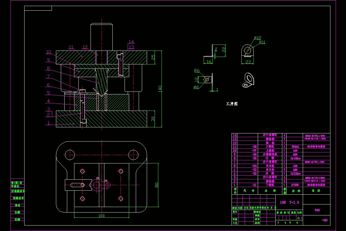 本设计为一玩具汽车电动机固定弯垫板的冷冲压模具设计,根据设计零件的尺寸、材料、批量生产等要求,首先分析零件的工艺性,确定冲裁工艺方案及模具结构方案,然后通过工艺设计计算,确定排样和裁板,计算冲压力和压力中心,初选压力机,计算凸、凹模刃口尺寸和公差,最后设计选用零、部件,对压力机进行校核,绘制模具总装草图,以及对模具主要零件的加工工艺规程进行编制。其中在结构设计中,主要对凸模、凹模、凸凹模、定位零件、卸料与出件装置、模架、冲压设备、紧固件等进行了设计,对于部分零部件选用的是标准件,就没深入设计,并且在结构设计的同时,对部分零部件进行了加工工艺分析,最终才完成这篇设计。