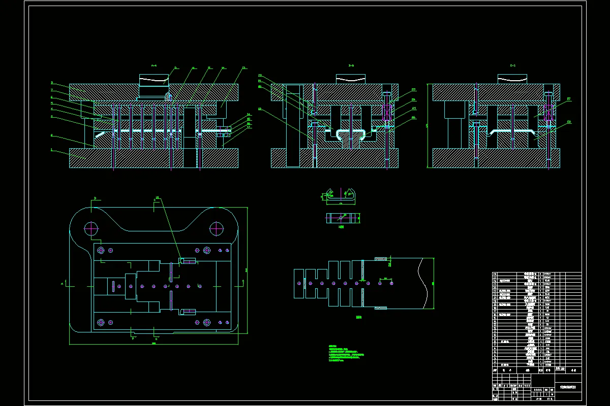 从工件结构分析,工件有冲孔、落料、弯曲等工艺组成,工件形状具备对称性。模具的设计的设计先从工件的工艺结构出发,根据工件图只要求和形状来确定模具的设计方案,进步一确定模具制造精度等级,和排样设计从而确定出模具的类型结构,从实际生产的角度出发,为了节约模具制造成本,提高产品生产效率,保证工件的生产精度,该工件的冲裁模具设计方案采用了级进模具冲裁。在模具设计前主要查找工件图纸中未标注公差的尺寸公差,根据尺寸公差来确定模具制造的精度,经过多次的排样分析以后,开始进行模具的结构设计,计算模具的闭合高度、卸料力、冲裁力、、冲裁间隙、模具装配配合间隙、凸模高度、压力中心、模具总压力,根据总冲压力选择冲压设备;所有的设计方案确定以后开始绘制模具草图、装配图、零件图、编写技术要求、设计说明书。