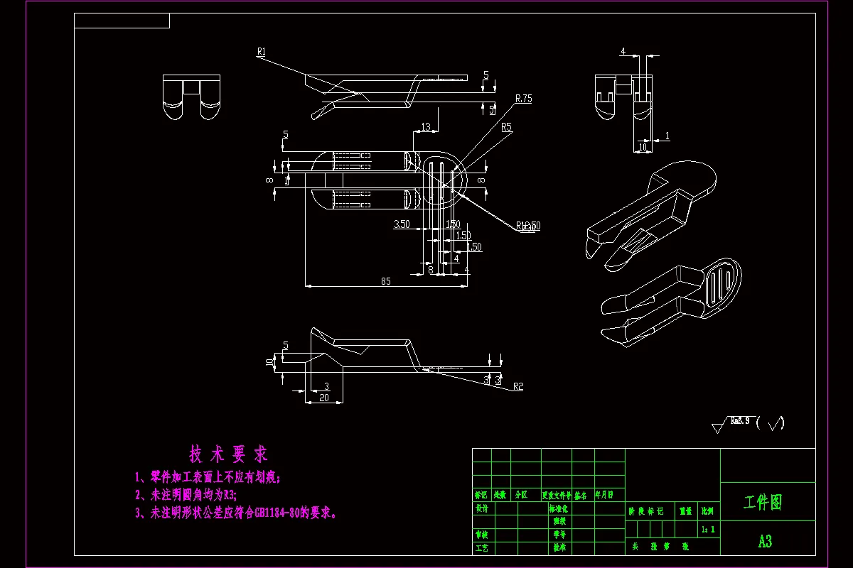 在说明书中第一部分,主要叙述了冲压模具的发展状况,说明了冲压模具的重要性与本次设计的意义,对冲压件的工艺分析,工艺方案的确定。通过,对零件排样图的设计,完成了材料利用率的计算。再进行冲裁工艺力的计算和冲裁模工作部分的设计计算。最后对主要零部件的设计和标准件的选择,为本次设计模具的绘制和模具的成形提供依据,以及为装配图各尺寸提供依据。通过前面的设计方案画出模具各零件图和装配图。