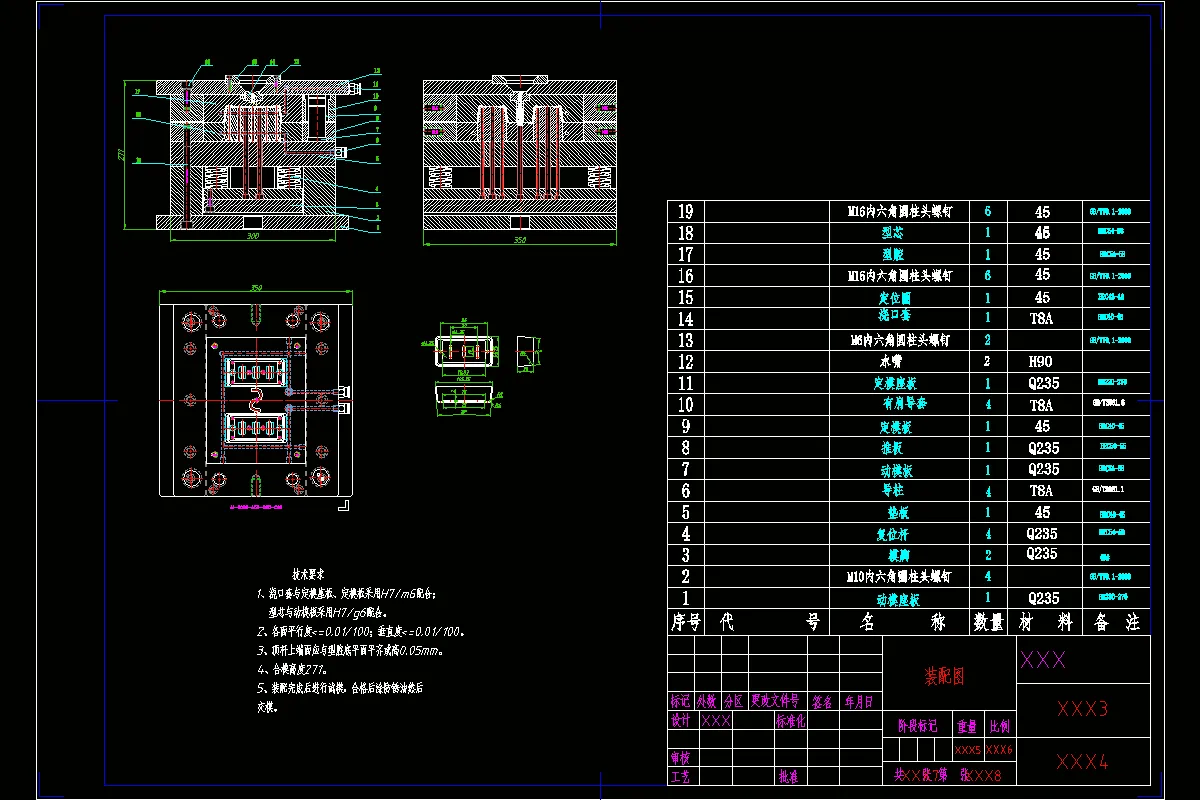 在正确分析塑件工艺特点和PP材料的性能后,对模具结构各工艺参数,包括锁模力、模具闭合高度等模具参数的进行了计算校核,设计了一副一模两腔、单分型面的侧浇口注射模具。利用AutoCAD或分析注射模的成型零部件,浇注系统,导向部件和脱模机构等。