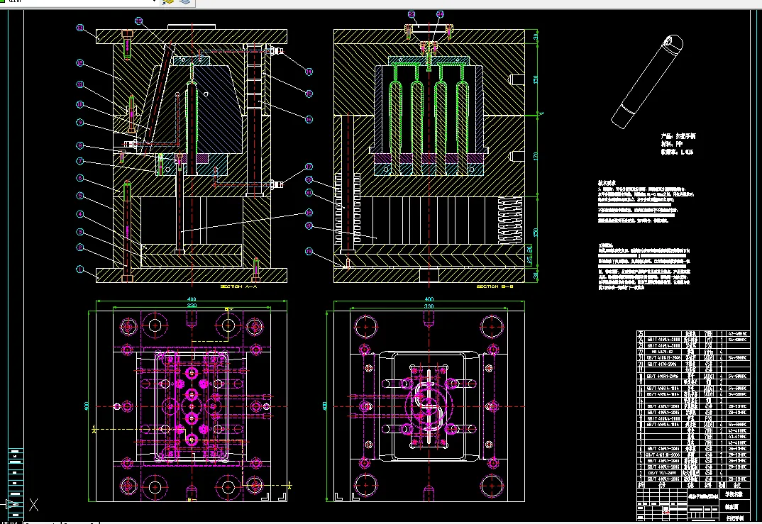 本设计的模具设计对象为扫把手柄,前期对于设计对象进行了相关的测量,数据的记录等;用三维软件UG来建模,建模时候的数据主要是前面测量得来的,并在塑件模型的基础上利用UG制造内的模具型腔模块对扫把手柄作出相应的注塑模模具设计,包括有塑件元件、滑块分型面、主分型面、浇口等,并且加入相应的模架、浇口、流道等;后期则是以之前作出的成果为基础使用CAD软件绘制出相应的二维图,也就是工程图,更加清晰的显示出塑件的结构以及模具的机构。