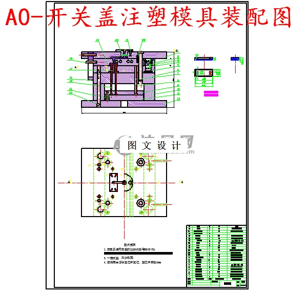 本制件的外围尺寸为57×24mm。本制件为开关盖,对之间的精度和表面粗糙度要求不高,所以取公差等级为5级,表面粗糙度为Ra 0.5 .成型方式为注射成型,一模两腔.根据塑件的结构形式,分型面选在开关盖的底平面确定型腔数 :该塑件精度要求不高,又是大批量生产.考虑到模具制造费用和制件尺寸,初定为一模两腔的模具形式. 本模具拟用一模两腔,推杆推出,浇口采用侧浇口.型芯中有四个小型腔,其中有四个小型芯一起固定在型心固定板上.