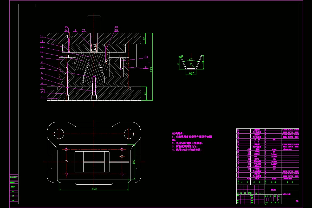 本设计主要对卡簧冲压模具进行设计。结合公司实际生产要求和产品的特点,在厂原有的设计上,对模具进行了改进设计。本设计对卡簧加工工艺进行了分析,得出了最佳加工方案,在充分保证零件质量与精度的前提下,选择高生产率的加工工艺,降低生产成本,从而有效地节约了材料。本设计中使用计算机软件进行了辅助设计,在保证高精度的同时简化了传统的繁琐计算过程,使设计更为便捷。 该卡簧从坯料到完全成形,以前是使用两套模具:剪料,弯曲,所设计的两套模具较为典型,也具有一定的代表性。本设计的重点与难点是多道工序的结合以及对凸、凹模刃口尺寸的计算,因为它将直接影响零件的质量。
