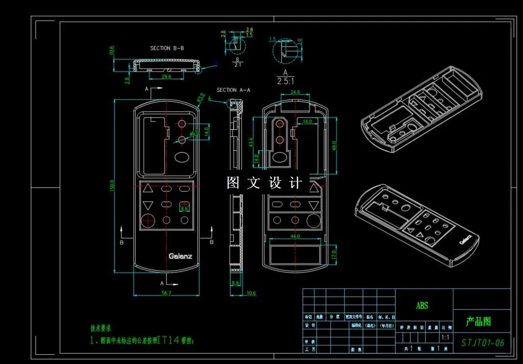 本次设计主要是空调遥控器前壳模具,需要结合这种前壳产品做出工艺和性能分析,并且要合理选取材料,对产品的表面以及精度要求有比较深刻的认识,合理的确定型腔结构以及分型面,并且选择满足要求的注塑机,确定合理的方案,以及浇筑系统跟成型零件的计算。