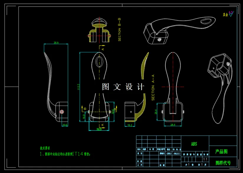 本次设计的产品为手柄塑件,具有重量轻,强度高,耐腐蚀,易清洁等 特点,为大批量生产产品。本次设计在针对产品进行工艺性分析后,确定模具分 型面、 型腔数目、 浇口形式、 位置大小; 其中最重要的是确定型芯和型腔的结构, 以及它们的定位和紧固方式。