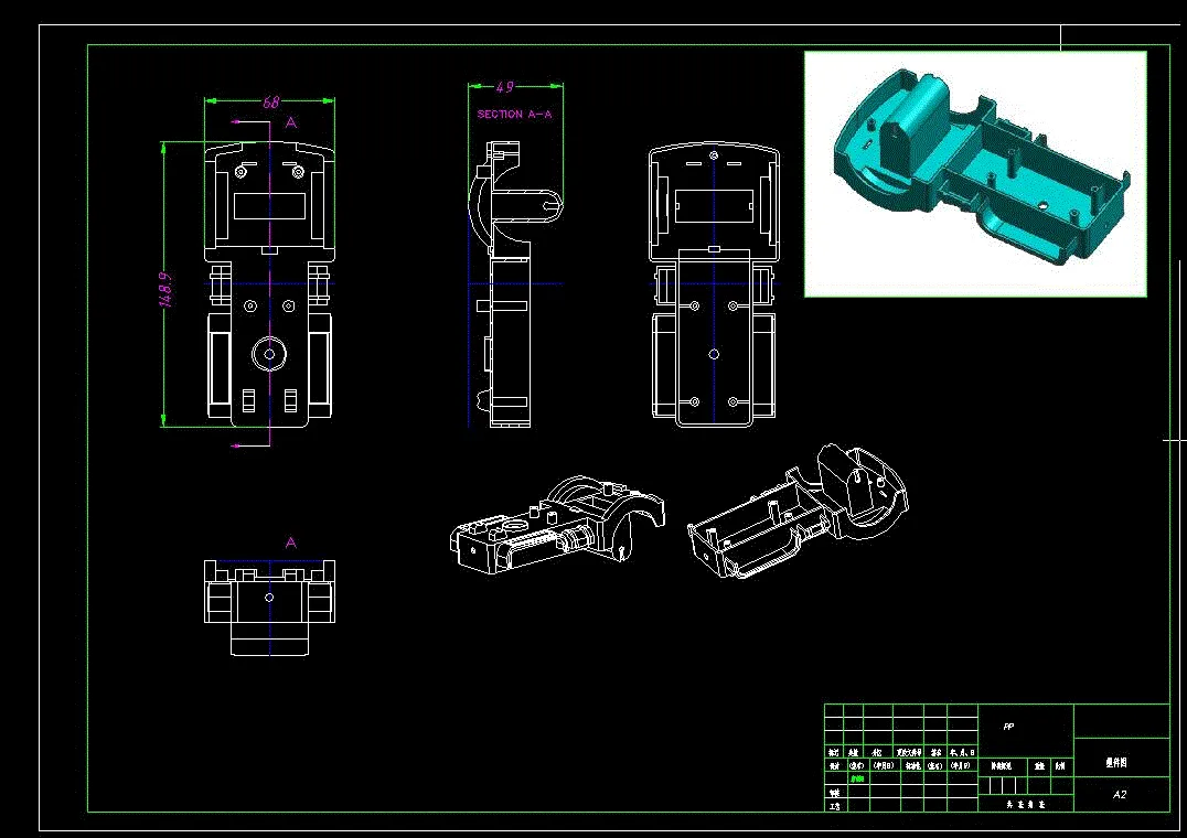 本文采用了对应的成型系统来保证模具加工的可行性、浇注系统方面尽可能的贴合实际注塑生产工艺需求、冷却系统设计方面能够使得塑件的冷却更加均匀合理。 采用一模两腔 侧进胶,斜顶侧抽芯,推杆推出的设计方案。