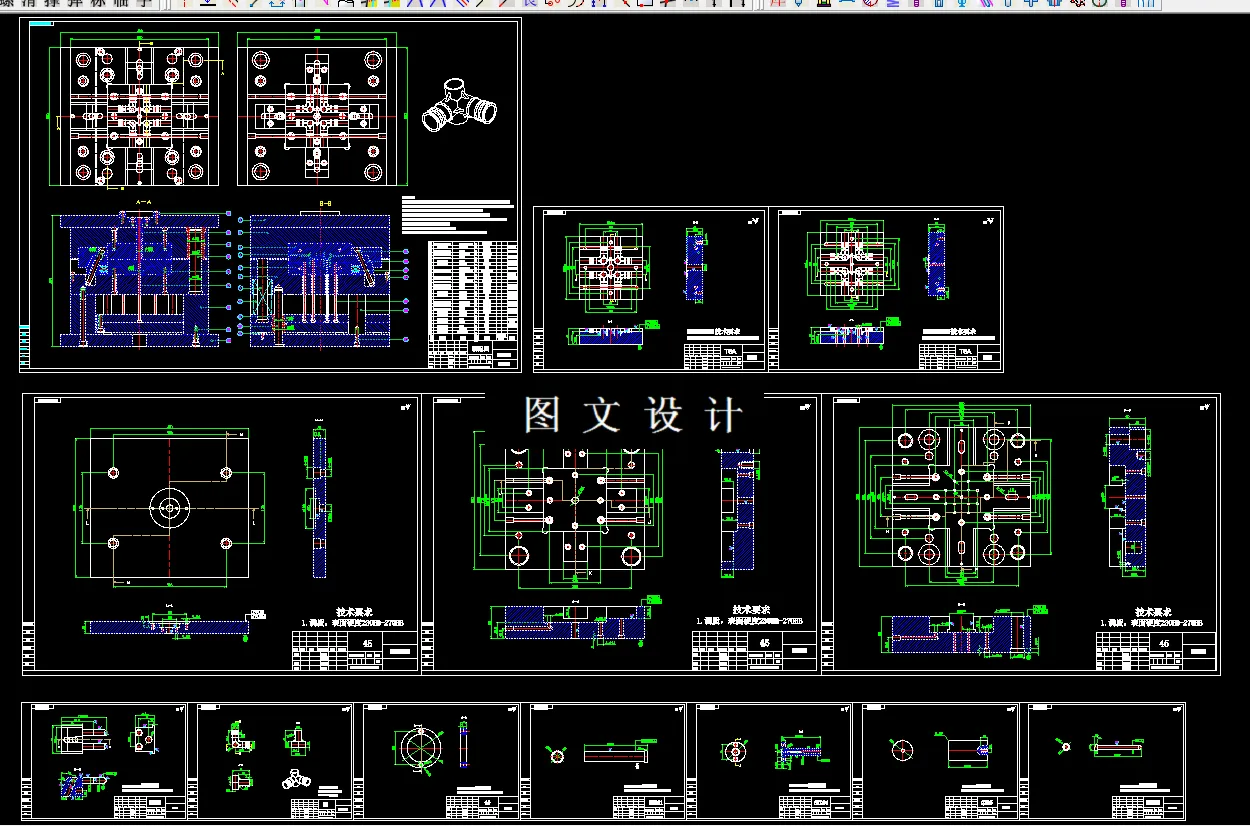 过大量的计算以确定模具复杂的结构和尺寸,通过不断的计算与修改,并在指导老师的悉心关怀和耐心指导下进行多次的反复修改,最终画出了装配图和零件图。 该模具采用一模四腔、滑块侧抽芯的设计方案。然后针对该方案进行了重点讨论。
