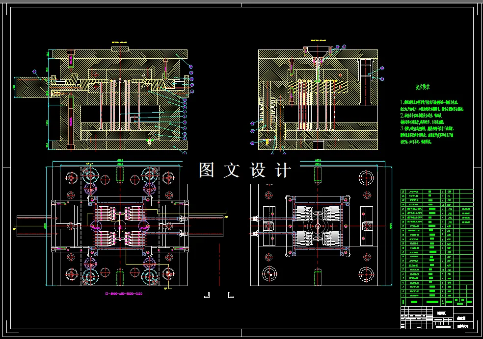 为保证塑件表面质量采用侧浇口,因此选用单分型面注射模,侧浇口自动脱模结构。模具的型腔采用一模四腔平衡布置,浇注系统采用侧浇口成形,推出形式为十六推杆推出机构完成塑件的推出。