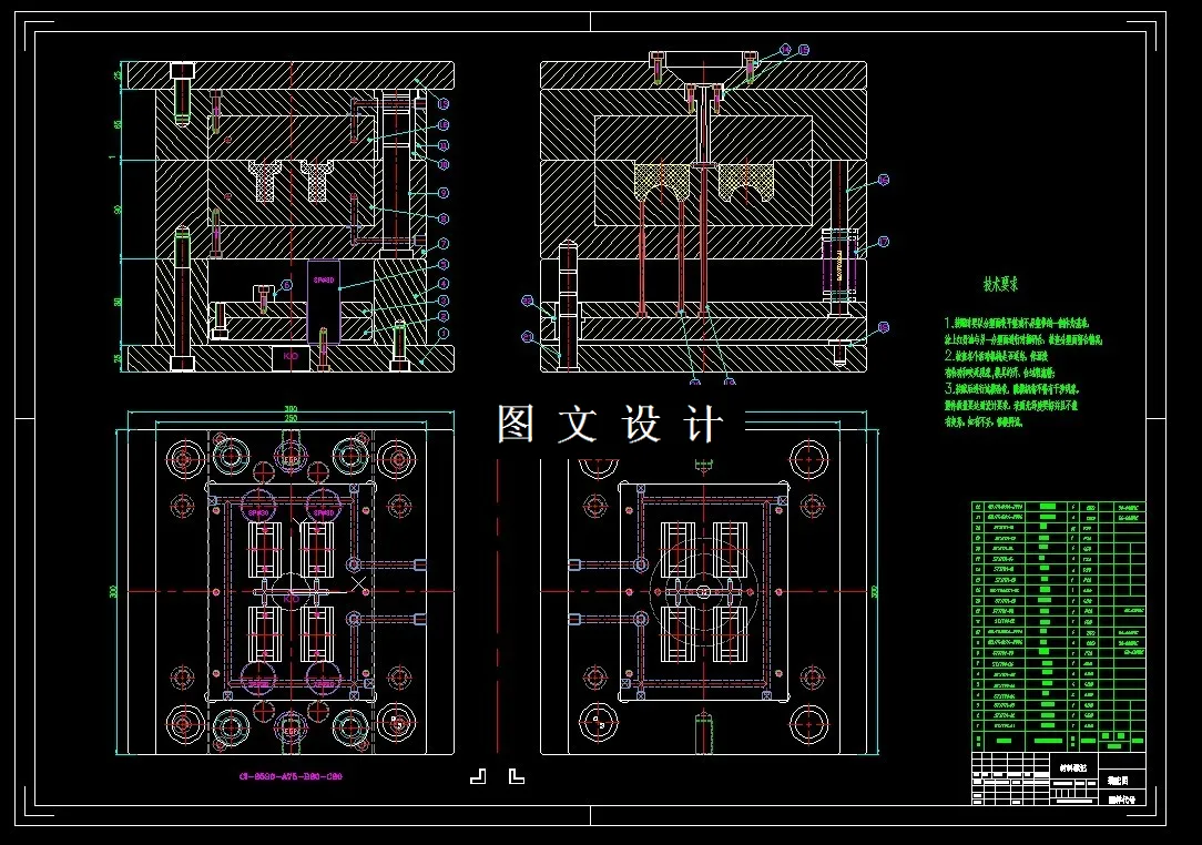 本次设计的产品为塑料轴承座,进行了脱模机构的设计,合模导向机构的设 计,冷却系统的设计等。最后绘制完整的模具装配总图和主要的模具零件图及编 制成型零部件的制造加工工艺过程卡片。采用的是一模四腔,侧进胶,顶针顶出的方案设计。