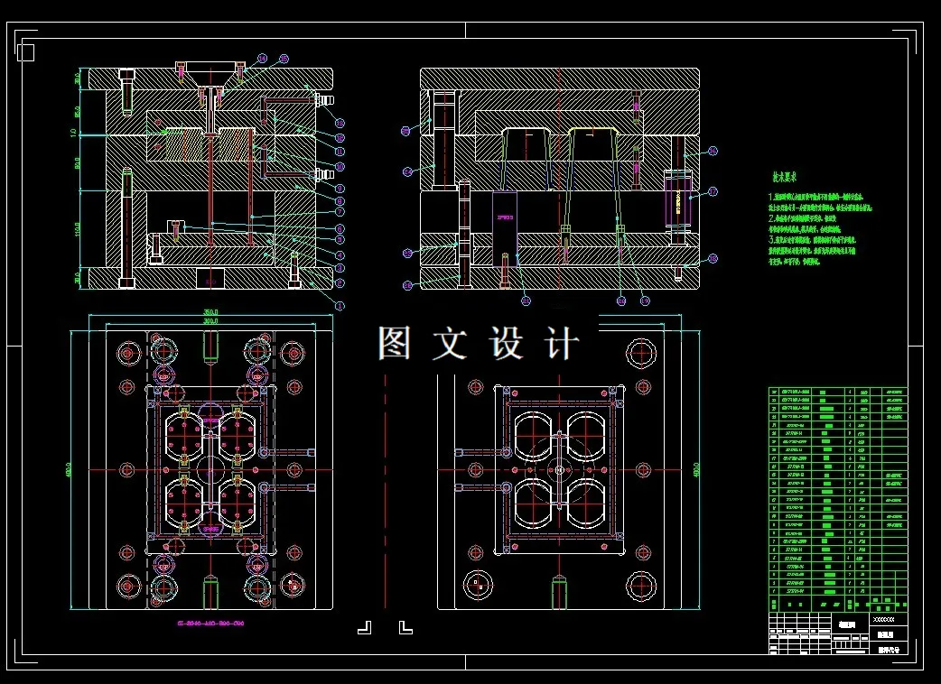 采用一模四腔,侧进胶,顶针顶出的方案设计,设计的三维是用UG软件,二维用cad。先排位做装配图,然后再做三维,做后做说明书,完整的一份设计图纸,仅供参考。724769