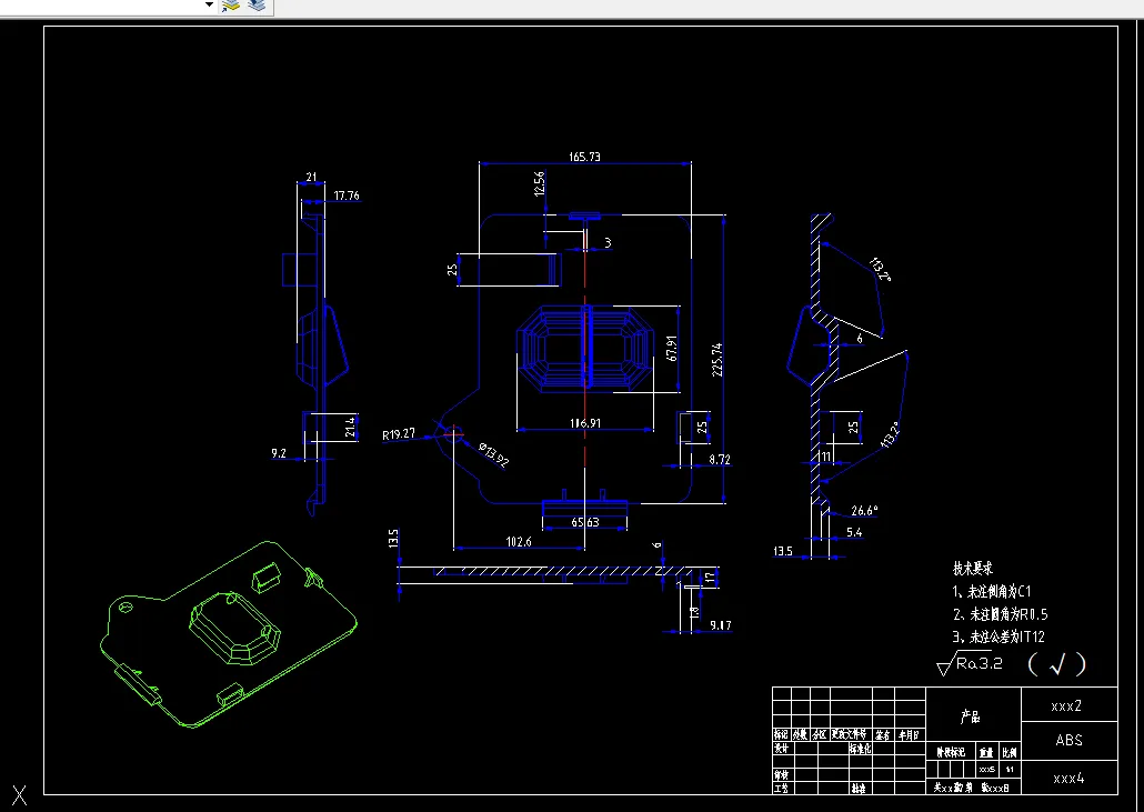 设计中主要进行的工作有首先是对塑料进行工艺性能的分析并画出塑件零件图,以及主流道的设计、模具型腔的分部以及型腔位置的选择,并要画出它们的零件图,模架的选择和校核、注塑机的选取和校核等,而其中最重要的一部就是对模具结构中型腔、型芯各径向尺寸和高度尺寸的计算,这些工作都要在查阅有关书籍后进行,总的设计,最后要画出模具设计的总装配图,并要对模具进行装配和试模,对其中出现的问题对模具进行改进,直到最后的零件符合设计要求。