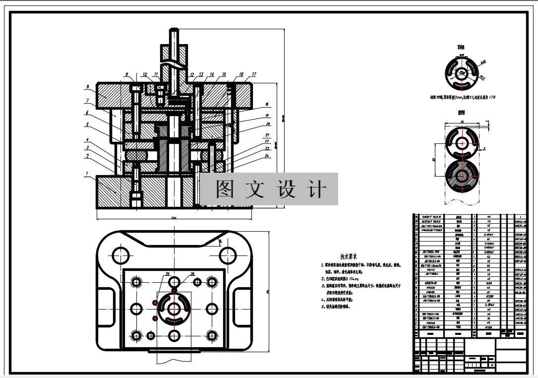 零件是圆形外形,冲孔和落料两个工序,设计方案采用倒装复合模,一起有装配图,全套零件图,零件图资料很全,零件图的尺寸标注详细,形位公差标注详细。 1459889