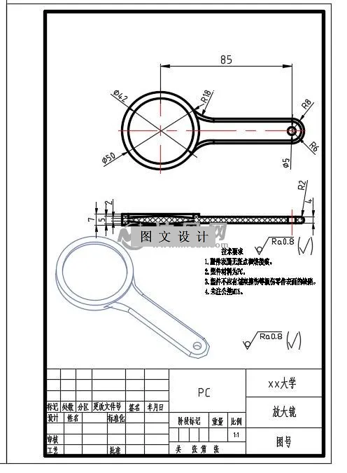 本设计主要是针对塑料放大镜的进行一整套注射模理论设计。虽然不能投入生产,但是里面的各个结构及结构都我们需要认真考虑的。本次塑料放大镜注射模设计运用自己所掌握的三维软件和二维绘图软件对塑料放大镜及塑料放大镜注射模模具进行绘制。从塑料放大镜产品的成型结构特征开始、到对分型面分析及位置的选择、浇注系统设计、成型零件结构设计和尺寸计算,脱模推出机构、冷却系统、与此同时合理地选用了注塑机型号,而且对注塑机压力,锁模力及顶出力等工艺参数进行详细校核,进而保证了设计的合理性及正规性。如此设计出的注射模结构才能确保模具工作运行可靠。