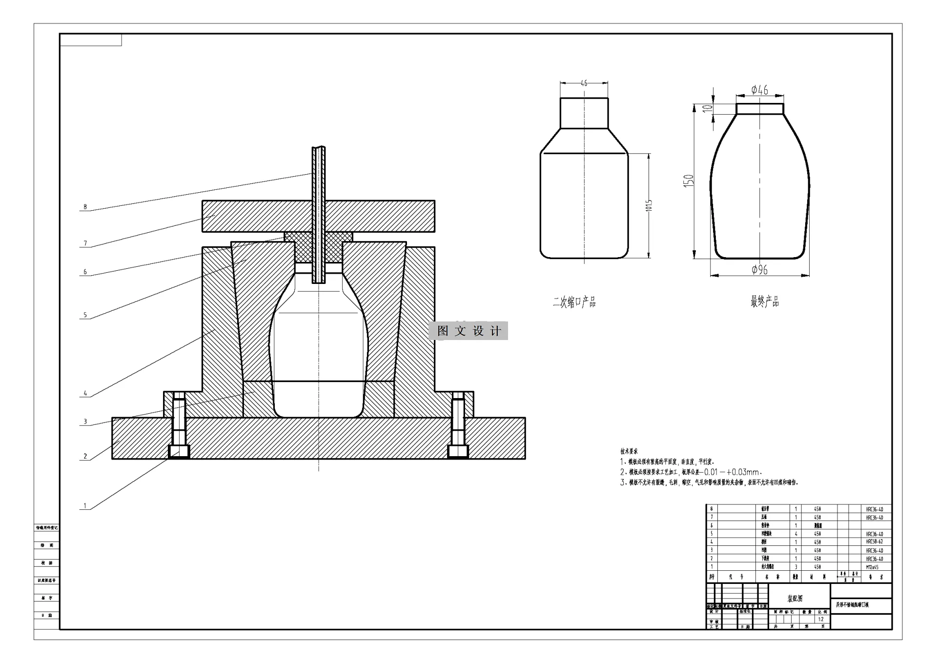 设计首先对冲模的基本成形机理及现状发展趋势做出简要阐释,指出冲模是一种低能耗高效率的产出方式,在综合分析产品工艺性指标及对比不同结构预案后,确定本次工件易采用连续模具的方案进行。 模具设计之前进行了排样结构设计和工艺计算两部分内容。第一部分通过排样参数选用和工件各工位的合理分解排布确定了包含冲裁,冲孔弯曲落料在内的多工位的合理结构,并以此为基础进行了第二部分,主要涵盖材料利用率,基本冲裁力参数,刃口精度公差等几部分的计算与校核,为后续模具结构具体实施打下基础。模具结构设计是在确保总体原则的情况下针对凸模,凹模,以及凸模固定板,辅助部件这几大方向完成了本体参数的设计和选用,最终将他们合理的装配,完成了本次工件级进模结构的设计。最后选用合理的压力设备与模具适配,以满足后续试模的需要。 在此次的设计当中,我翻阅查看了大量的模具设计资料,在异形不锈钢成形模具的设计与应用当中,和以前的设计方法相比较而言,模具的广泛应用,使得产品的质量得到了巨大的提升,模具的创新思路以及要求要紧跟现代化的步伐下,需要与未来的发展相结合。 本次设计的内容为异形不锈钢成形冲压模,完成冲孔、落料、拉深三道工序。使用AUTOCAD软件完成零件的绘制并完成装配图的绘制,进而完成装配工程图和相关的零件图。