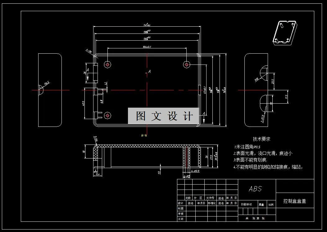 在本次模具设计中首先根据指导老师所发任务中控制盒绘制出控制盒盖三维图,通过分析它结构复杂程度以及尺寸精度要求来设计合理的模具方案,接着对产品的塑料原材料进行了选择并做出分析,初选了注塑机型号为HTF160J/TJ。由于产品有装配要求,尺寸精度要求比较高,型腔数目决定采用一模两腔结构,型腔排布采用一字型排列方式,本次设计分型面位置选在了沿着产品底面形成的最大轮廓面处,由于产品表面要求不高,所以选择了侧浇口浇口类型,本次设计的脱模机构选择了推杆和推管推出方式。然后为本次塑料模具设计设计一套模具冷却系统。最后对注塑机主要参数进行了校核。