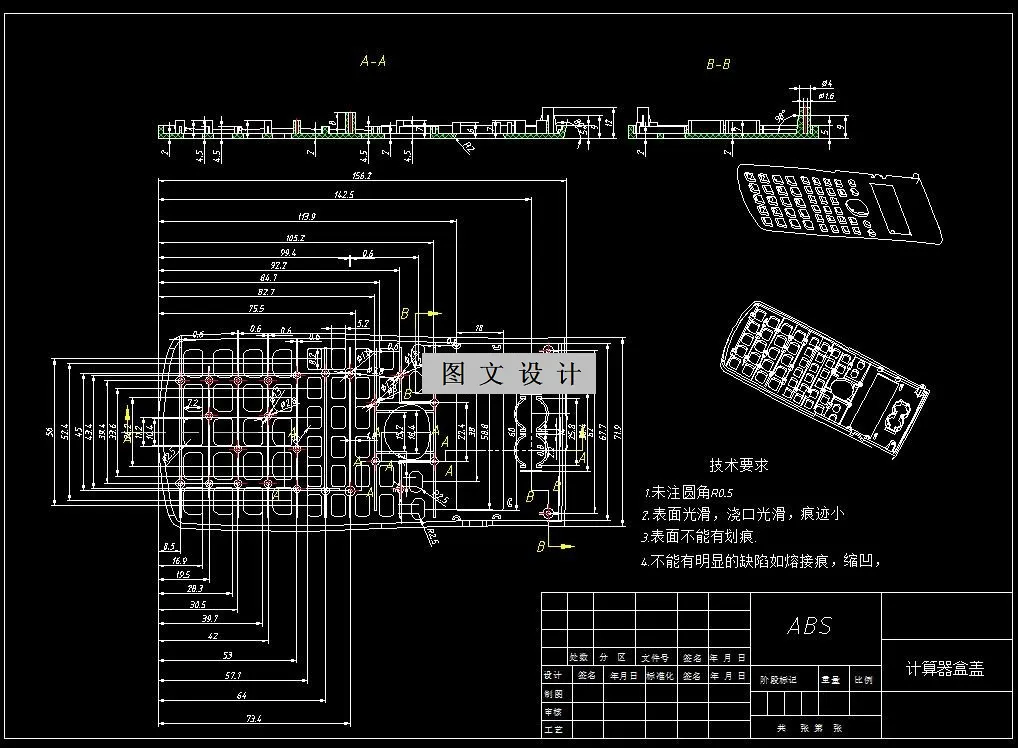 本文研究的是计算器面板的注塑成型模具设计。在本次模具设计中首先绘制出计算器面板三维图,通过分析它结构复杂程度以及尺寸精度要求来设计合理的模具方案,接着对产品的塑料原材料进行了选择并做出分析,初选了注塑机型号为XS-ZY-250。由于产品有装配要求,尺寸精度要求比较高,型腔数目决定采用一模两腔结构,型腔排布采用一字型排列方式,本次设计分型面位置进在了产品底面最大轮廓面积处,由于产品表面要求不高,所以选择了侧浇口浇口类型,本次设计的脱模机构选择了推杆和推管一起推出方式。为了保证产品的成型质量缩短冷却成型时间为模具设计了合适的冷却系统,最后对注塑机几个主要参数进行了校核。1089435