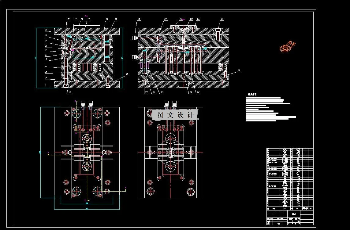 水杯封盖注塑模具设计主题。模具为一模两腔,侧浇口,塑件上侧孔结构采用斜导柱抽芯机构成型,推杆推出,本次设计采用CAD和UG软件进行绘制,绘制方法先测绘零件图通过UG建模画出三维,根据分型画出三维装配图,再根据三维图使用CAD画出二维装配图和非标零件图。利用辅助软件绘图减少了绘制时间,绘制的思路也清晰,软件的使用也更加的熟练了。本次采用的模架为龙记GB国标模架,此模架是大型企业模具专业设计的通用模架,此模架是全国公认的。本资料含有模具装配图、模具三维、多张模具零件图等等