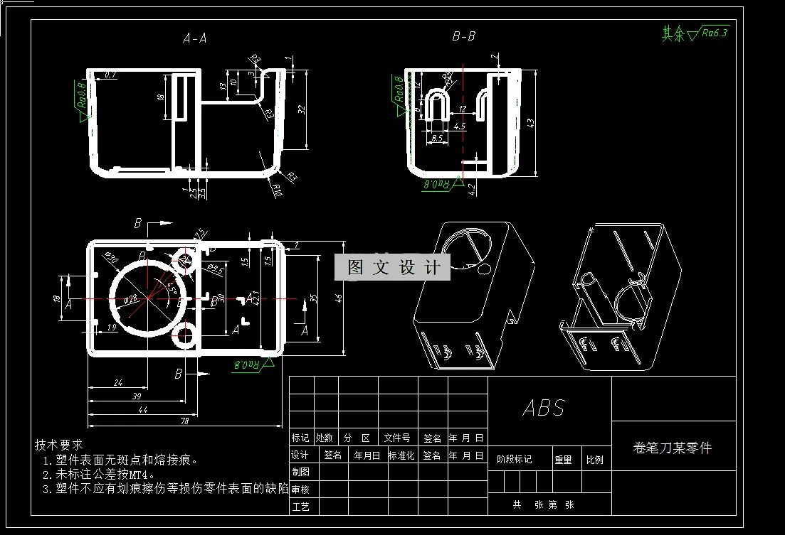 参考资料卷笔刀削笔刀盒盖注塑模具设计主题。模具为一模两腔,点浇口,塑件上侧凹结构采用斜导柱抽芯机构成型,推杆推出,本资料含有模具装配图、模具三维、多张模具零件图等等