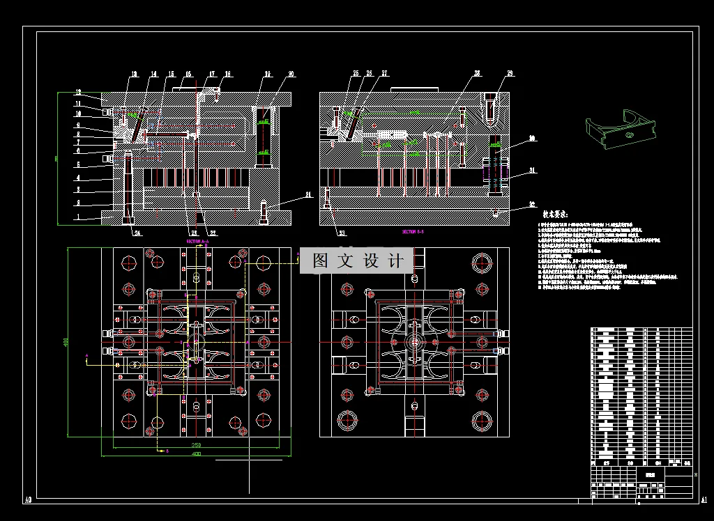 参考资料PVC管管夹注塑模具设计主题。模具为一模四腔,侧浇口,塑件上侧凹结构采用斜导柱抽芯机构成型,本资料含有模具装配图、模具三维、多张模具零件图