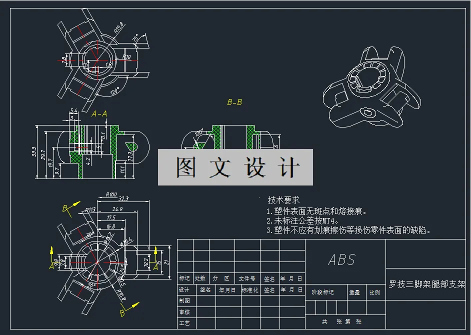 本次设计主要内容为成型罗技三脚架腿部支架设计一套塑料模具方案,在开展方案设计之前首先对罗技三脚架腿部支架结构做出了分析,然后根据其使用要求为罗技三脚架腿部支架选择合适的ABS材质,本次设计型腔数目为一模四腔的结构,本次设计中浇口形式采用了侧浇口进胶的方式,通过三维软件获得了产品体积,并对本次模具选定了型号注塑机及龙记标准CI模架型号。确定了模具最佳分型面位置,然后对主要的模具结构比如浇注系统、脱模机构、模具冷却系统进行详细的设计及计算。在成型零部件设计时,对成型零件的结构形式做出了选择并对成型零件的成型尺寸进行计算。最后对所选注塑机型号进行了校核。进而保证了设计的合理性及正规性。如此设计出的注射模结构才能确保模具工作运行可靠。