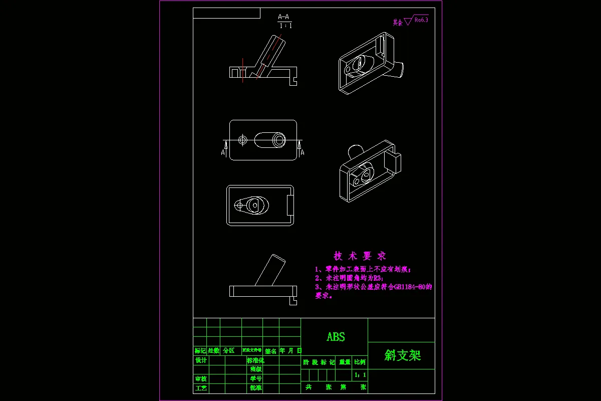 在设计过程中,分别采用了ProE和CAD软件,其中,前者主要是进行零件造型;而后者是帮助我设计得出了塑件的体积和重量,并对结构型式以及浇注系统、推出机构、型芯型腔的结构设计有很大设计帮助。经过一系列的设计,得出一张符合比例要求的总装配图。在设计中主要的重点也是难点是冷却系统以及侧抽芯方面。模具型腔数目采用了一模四腔结构,在抽芯方面使用了斜顶杆抽芯。优点在于结构简单,满足了精度的要求,材料的用量上可以节约一部分,在生产效率和经济上可以很大的提升。