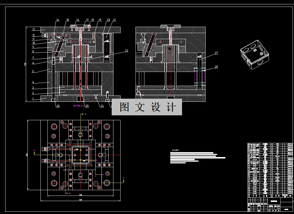 分析户外接线盒结构以及成型工艺性,为户外接线盒选择合适材料ABS,确定型腔数目为一模一腔方案,然后确定分型面位置,紧接着展开了浇注系统,脱模机构,抽芯机构,模具冷却调温系统的设计,然后为成型零部件结构形式进行选择,并计算成型零部件的主要尺寸,本次模具设计所选注塑机的型号为HTF160J/TJ,通过校核注塑机主要参数,验证所选型号注塑机满足要求,本次模具所采用的模架为AI模架。最后根据以上所设计的内容,通过所掌握的二维和三维软件完成了模具装配图、模具三维装配体以及模具零件图绘制。 关键词:户外接线盒;AI模架;