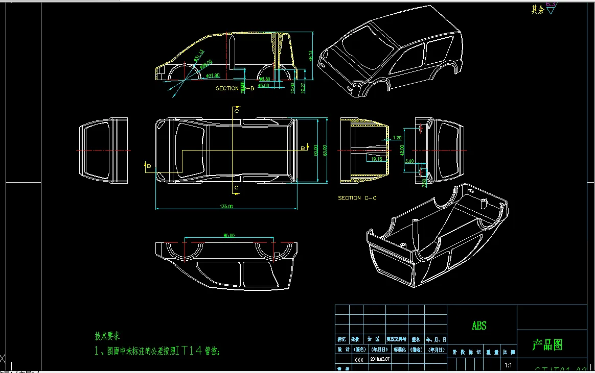 塑料是一种可塑性的合成高分子材料,具有重量轻且坚固,耐化学腐蚀, 电绝缘性好,价格便宜,可塑性好等特点,广泛应用于电脑、手机、汽车、电机、 电器、家电和通讯产品制造中。 注塑成形是成形塑件的主要方法之一, 是指使用注塑机将热塑性塑料熔体在 高压下注入到模具内经冷却固化获得产品的方法。注塑的优点是生产速度快,效 率高,操作可自动化,能成型形状复杂的零件,特别适合大量生产。 本次毕业设计的产品为玩具车,具有重量轻,强度高,耐腐蚀,易清洁等 特点,为大批量生产产品。本次设计在针对产品进行工艺性分析后,确定模具分 型面、 型腔数目、 浇口形式、 位置大小; 其中最重要的是确定型芯和型腔的结构, 以及它们的定位和紧固方式。此外还进行了脱模机构的设计,合模导向机构的设 计,冷却系统的设计等。最后绘制完整的模具装配总图和主要的模具零件图及编 制成型零部件的制造加工工艺过程卡片。实践证明:该模具结构合理、可靠,并 能保证产品质量,对此类注塑产品的模具设计有参考价值。