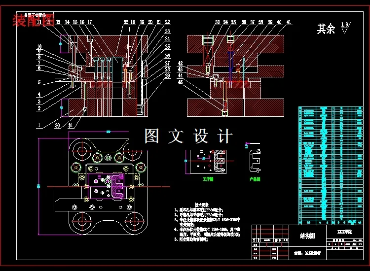 先分析零件的冲压工艺;确定模具的总体结构;结合零件的冲压工艺及模具的总体结构设计排样图;根据排样图,计算利用率、冲载力、压力、选用设备及刃口的尺寸。根据资料再用AutoCAD,对模具进行设计,然后绘出装配图和零件图进行标注