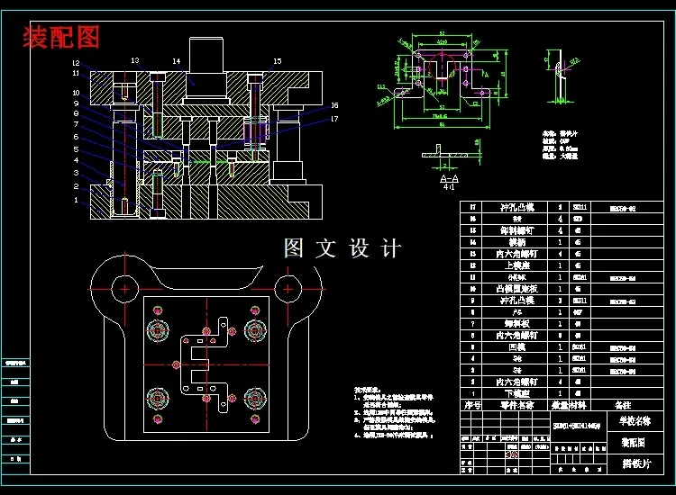 通过对深入学习,对此零部件模具设计时的设计方式有了雏形。先分析零件的冲压工艺;确定模具的总体结构;结合零件的冲压工艺及模具的总体结构设计排样图;根据排样图,计算利用率、冲载力、压力、选用设备及刃口的尺寸。根据资料再用AutoCAD,对模具进行设计,然后绘出装配图和零件图进行标注,并编制零件的加工工艺卡,使理论和生产实际知识综合运用,从而培养和提高了我独立工作的能力。