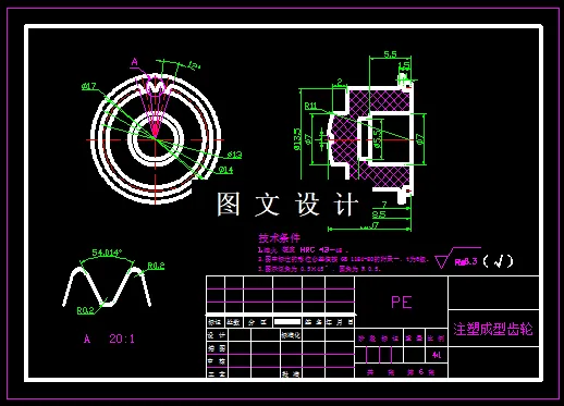 此零件为传动器主动齿轮,零件的材料为PE,零件的形状属于圆形结构,端面是齿形,分析零件的形状,选择外形最大面积处作为分型面,将浇口位置设计在侧面,选择一模两腔结构,设计两板模结构,要计算型腔尺寸和外形尺寸,然后选择标准模架,绘制模具图纸,选择合适的注塑机,并校核参数。