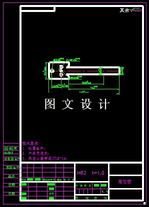 此定位板零件,成T字形结构,形状不规则,内部还有4个小圆孔,在设计排样图时,将大头和小头部分结合,合理设计排样图,计算出模具刃口尺寸和外形尺寸,然后绘制出倒装结构模具的装配图,零件图,计算冲压力大小,选择合适的压力机。