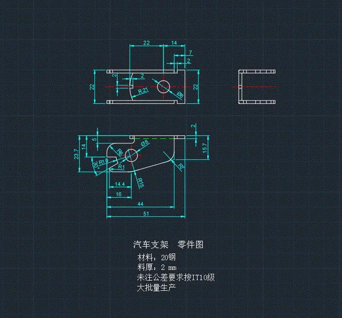 此压盖零件,形状简单,是个筒形件,只是底面多了个翻孔,基本工序有落料,拉深,冲孔,翻孔,工序比较明确,通过计算展开尺寸,预孔直径,设计落料拉深,冲孔翻孔模,计算模具外形尺寸,选择标准模架,选择合适的压力机并校核。