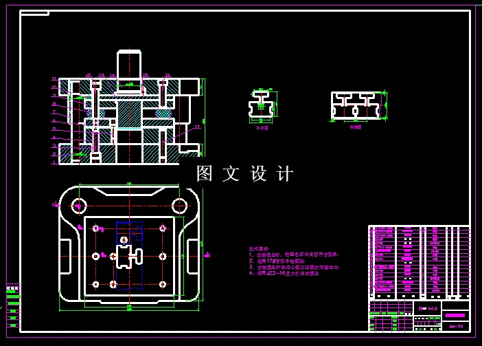 该后盖板零件,是个多角弯曲零件,且弯曲的方向和方式不同,有U形和V形弯曲,展开后的零件形状也不规则,因此计算排样图,刃口和模具外形计算后,绘制倒装落料冲孔复合模。再设计V形弯曲和U形弯曲模,注意要避免零件与模具之间有干涉,绘制弯曲模结构图。