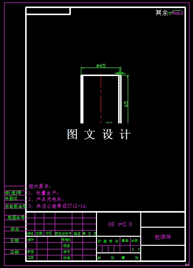 本次设计的拉深件,其形状规则,为筒形件,拉深直径小于拉深件的高度值,因此,此零件必然需要多次拉深,具体通过详细计算得到工序图,本次设计只需要设计其中的首次拉深工序。