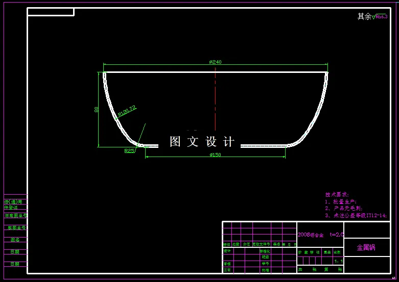 本次设计的是铝材料的碗形零件,材料厚度为2.0mm,通过计算展开尺寸后得知,该零件展开后为圆形,因此,落料和拉深两个工序可以分开设计,本次设计只针对落料工序进行计算和设计结构。