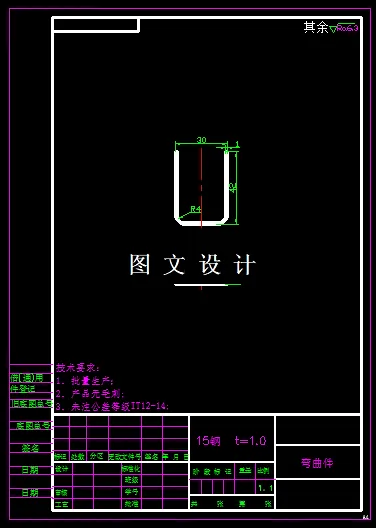 本次设计的课题,形状简单,为U形,但是两侧弯曲的高度尺寸比较大,所以需要考虑工件的回弹,设计过程中,上模和下模的卸料方式,尤为重要,具体设计方案见CAD图纸,本次设计只是设计了其中的弯曲模。