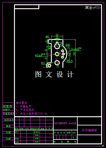 本设计,针对引子挂线板,进行冲孔落料级进模设计,工件材料为1Cr18Ni9Ti,厚度为0.8mm,故采用弹性卸料装置,弹性卸料装置除了卸料的作用外,在冲孔时还起到压紧工件的作用,上模弹性力由橡皮产生,冲孔和外形落料分两个工步冲压实现,工序之间没有干涉,具体见图。