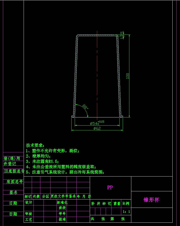 由制件零件图可以知道:制件的外形不规则,中间有两个缺口,四周无R角,所以可以采用落料冲孔的方法尖角无法实现,所以需要考虑方案结合,才能冲出尖角,在设计模具时可以将两个缺口合并成一个方孔,最后再落料,分开后需要多次冲裁才能完成加工,具体方案见CAD排样图及模具图。