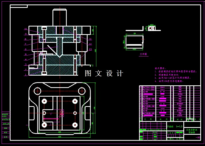 本次设计图形,经过测量和计算,孔边到孔边的最小距离是1.25mm,而材料厚度为1.0mm,1.25mm接近1.0mm,所以不符合复合模设计原理,因此这小孔需要单独冲压,经过以上分析,选择四副模具,虽然工序多,周转困难,但符合设计要求和原理,能保证工件的质量和模具的寿命。