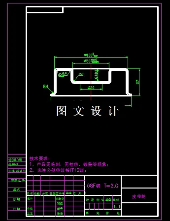 此零件是皮带轮,材料厚度为2mm,她的成型精度对整套产品的性能有很大影响,故它在拉伸时金属流动性差,容易拉裂而达不到相应的拉伸高度,故而造成废品。所以本次课题难点就是在于中间材料流动情况分析及模具设计。通过分析后选择合理的工序组合,选择4套模具设计方案。