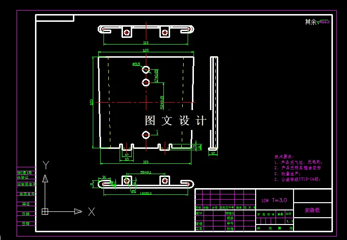 从以上结构上看,模具结构相对复杂,加工和维修也困难,模具结构复杂就容易出错误,比如加工的误差积累,会导致一些不该出现的问题出现,虽然成本低了,但前期投入的时间和精力也不少,如果采用普通的弯曲模,虽然模具成本高了点,但模具加工方便,维修方便,模具结构简单,从模具成本的角度出发,两幅简单的弯曲模的成本比一副复杂的弯曲模的成本高不了多少,仅仅多了一个冲次,产品的成本高了一些,本次设计结合实际设计能力,考虑采用普通的弯曲模,即落料冲孔,弯曲1,弯曲2,3副模具。