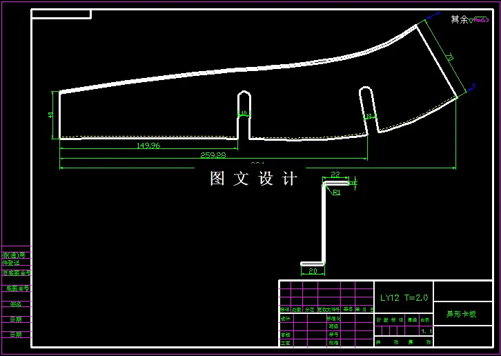 本零件采用的是2mm的铝带冲压而成,由图而知该图的零件外形尺寸不大但是外形复杂,要求的精度也不高。所以一次冲裁很难完成。有两边弯曲,且为Z形上下弯曲,所以弯曲和落料必须分开冲压,所以从形状上看,该产品需要两副模具冲压,从材料来说,该零件比较薄,便于成型,故该零件有利于冲压成型。落料外形采用激光切割,只需要在落料形状上增加工艺耳片,和工艺孔,可以有效防止弯曲时的材料流动,工艺耳片在弯曲成型后再切除。