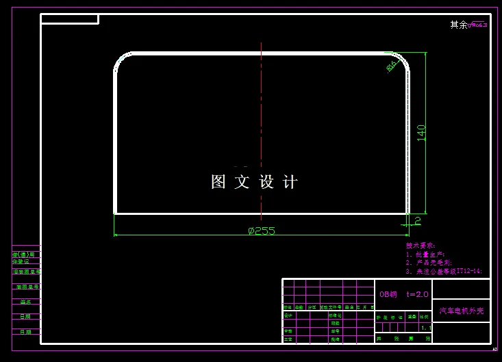 电机的机壳和机盖决定了该电机中定子和转子的相对位置,是组成电机的关键零件。机壳和机盖制造品质的好坏直接影响到电机的输出功率、运行噪声和发热等电机的性能。图2-1是某车启动电机外壳的零件图,材料为08T钢,厚度为2mm。电机壳的内筒壁上装有定子并支撑着装有转子的轴轴承。因为电机的定子和转子的间隙较小且较均匀,所以零件头部的轴承室和内筒壁的尺寸精度以及两处的相对位置精度较高。 该零件属于带小法兰的筒形拉伸件,通过拉深加工而成。关键是确定拉深次数与拉深系数,08T钢属于普通碳素结构钢,含碳量低,塑性、韧性较好,抗剪强度为260-360Mpa,抗拉强度为330-350Mpa,有利于拉深成型加工。