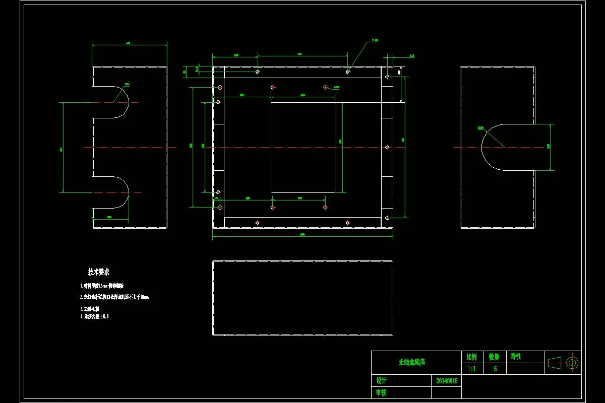 CAD-消声器冲孔翻孔复合模具设计,包括装配图,零件图,设计计算。 根据零件图上的尺寸标注及公差,可以判断属于尺寸精度为IT12—IT14的经济级普通冲压。10#钢板属于碳素结构钢,屈服极限时210MPa,具有很好的可冲裁性,工件结构形状冲裁件内,外形均无尖锐清角,对模具寿命不影响,孔与边缘间的距离大于1.5t,工件的直径d>t满足冲孔模可冲压的最小孔径。