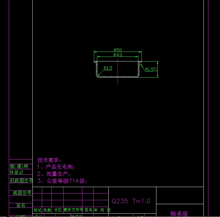 本次课程设计的内容是用模具生产轴承座,并且制定出相关的工艺路线,设计出生产所用模具。工艺路线主要包括落料、拉深两道工序,设计为落料拉深复合模具。冲压工艺的选择是在查阅了相关资料和对产品外形成尺寸进行了仔细分析的基础上制定出来的;冲压模具的设计综合考虑了经济性、零件的冲压工艺性和复杂程度等诸多因素;产品毛坯的展开尺寸计算是在方便计算又不影响零件成型的前提下转化为熟悉的模型进行的。模具的主要部分零件给出了相应的尺寸计算,同时给出了详细的零件结构设计,并附有相应的零件图,最后根据零件结构设计和生产零件的要求生成了总装配图。