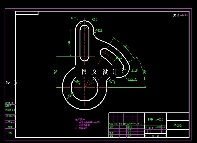 PROE-限位板落料冲孔倒装复合模具设计,包括装配图,非标零件图,3D立体图。 由限位板零件图可知,该零件为一般的冲裁结构件,形状比较简单,无凹陷或其他形状突变,尺寸比较小,无尖角。其尺寸精度、各处的圆角半径均符合冲裁工艺要求。