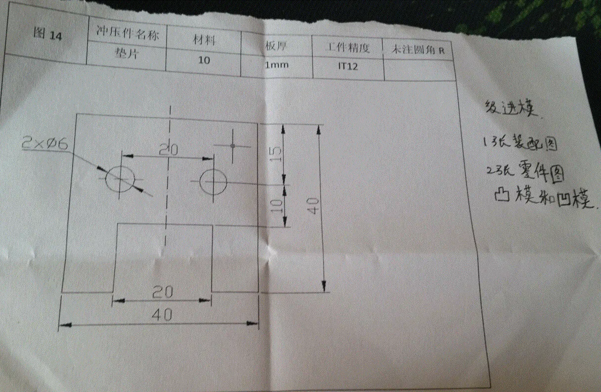 止动片落料冲孔倒装复合模设计,装配图+所有非标零件图。 根据制件的工艺分析,其基本工序有落料、冲孔两道基本工序,按其先后顺序组合,可得如下几种方案; (1) 落料——冲孔;单工序模冲压 (2) 冲孔——落料;单工序模冲压。 (3) 冲孔——落料;连续模冲压。 (4) 落料冲孔;复合模冲压。